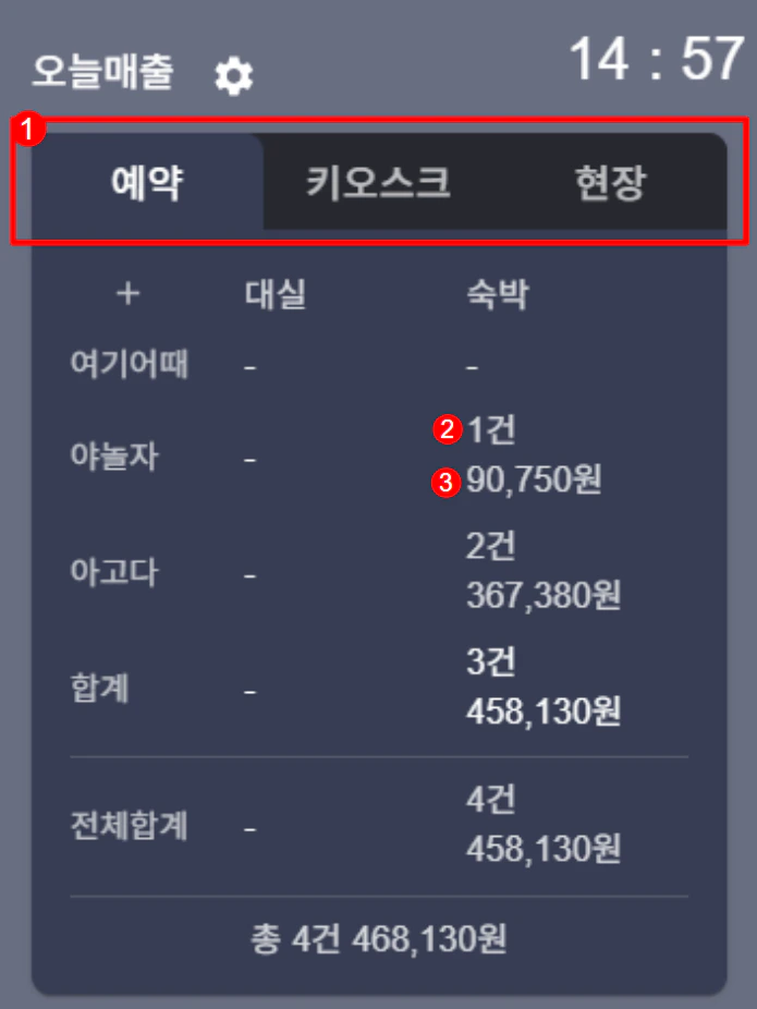 당일 입실 예약 건의 매출과 결제 내역이 당일에 생성된 매출(미수금)의 총 계예약 외 매출이란?